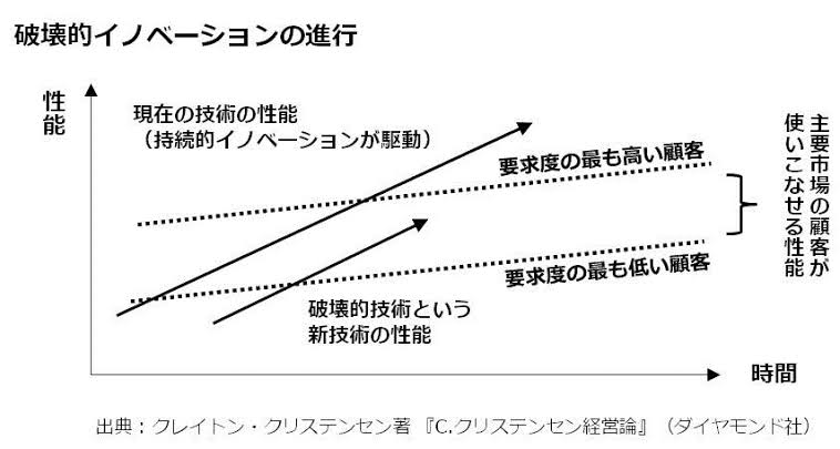 理由は、市場において求められる主要機能が、機能への要求が厳しくない顧客層の求めるレベルを超えた時、どこからか破壊的な変化が起こります。破壊的な変化(イノベーション)は、最初は自社の主要顧客とは被らず、もしろ主要顧客からは求められていない価値軸であるため、優良企業ほど素早い対応ができません。またこれまで培ってきた組織のプロセス・価値基準・能力や製品の競争軸は、破壊的な変化の際はむしろ障害になることが多いです。そのため、自ら破壊的イノベーションを起こしたり、変化に対応するためには、独立した小さな組織に任せることを勧めています。