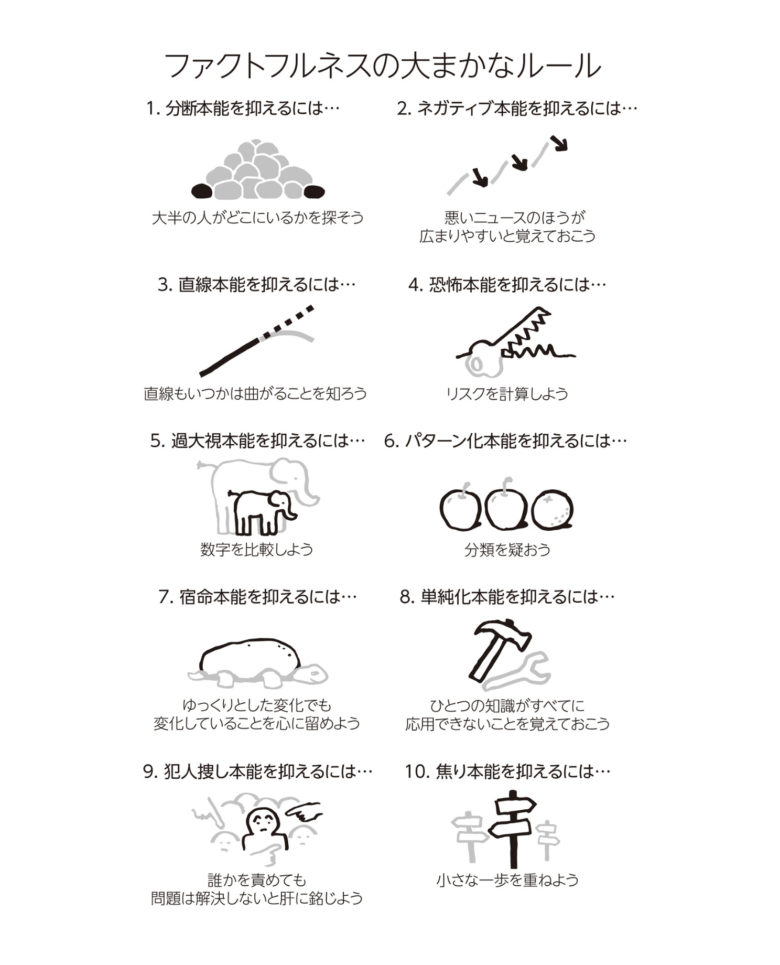 ファクトフルネスとは、以下10の思い込み(本能)を乗り越え、データを基に世界を正しく見る習慣のことです。各思い込みと対策を引用します。