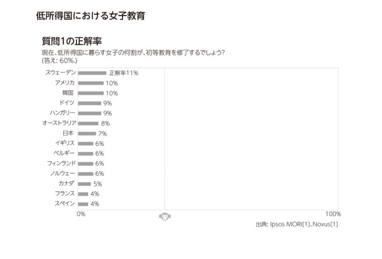 他にも世界の現状に関する3択問題が計13問あるのですが、私の正解率はチンパンジー以下でした。。(チンパンジー以下とは、適当に選んでも当たる割合のことで、ざっくり3割。もし他の質問にも興味があればこちら)