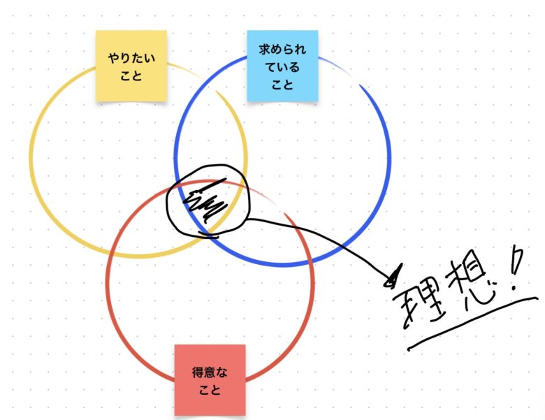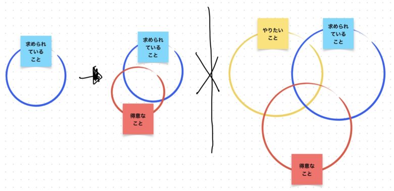 仕事を選ぶ際の3つの軸*(「やりたいこと」「得意なこと」「社会や会社から求められていること」)の中でも、自分の「やりたいこと」にハマることが最も重要で困難です。ここにハマらないと毎日が楽しくないし、自己成長も遅いと感じます。