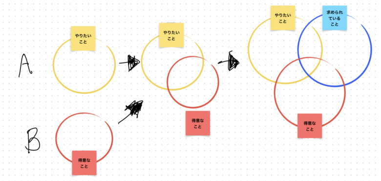 ちなみに私はこの仕組みに流されていました。学生時代は深く考えずに学部に関連していそうで知っている会社を中心に就活し、就職しました。そして会社から「求められること」として、営業職につきました。それが時間と共にある程度の「得意なこと」にもなっていきましたが、そこから「やりたいこと」になることはなかったです。