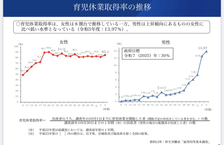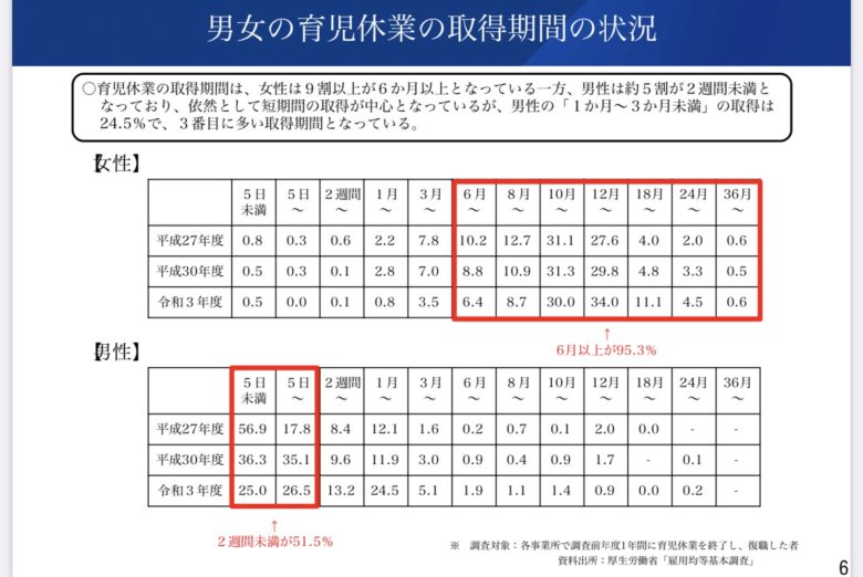 一方 女性の育休取得率は85%、うち半年以上取得は95%と、激しい男女格差が見てとれます。数字で見るとまた印象が変わりますね。