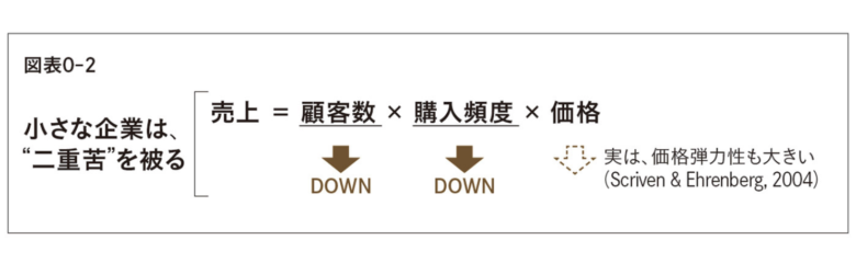 - 購買重複の法則:市場シェアに応じて競合と顧客基盤を共有する。つまり大きなブランドはより多くの顧客を、小さなブランドはより少ない顧客を共有している。