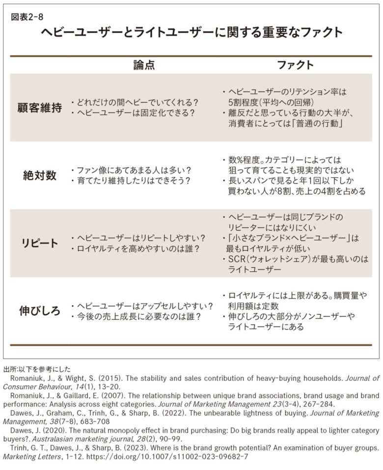 - 平均への回帰:ヘビーユーザー化や離反は、他の要因と独立しており、マーケティングでコントロールできる変数ではない。その時期だけのデータで見て、ヘビーユーザーに分類しただけの場合も多い。しかし一時的な離反なのか、本当の離反(想起集団から外れる)なのかは混同しないように注意。