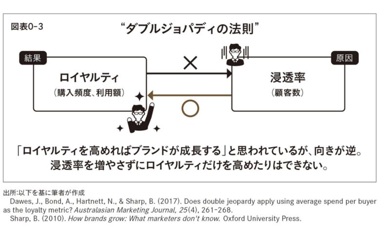 - ダブルジョパディの法則:マーケティングシェアの低いブランドは、購買客数も非常に少ない。またこれらの購買客は行動的ロイヤルティも態度的ロイヤルティもやや低い。