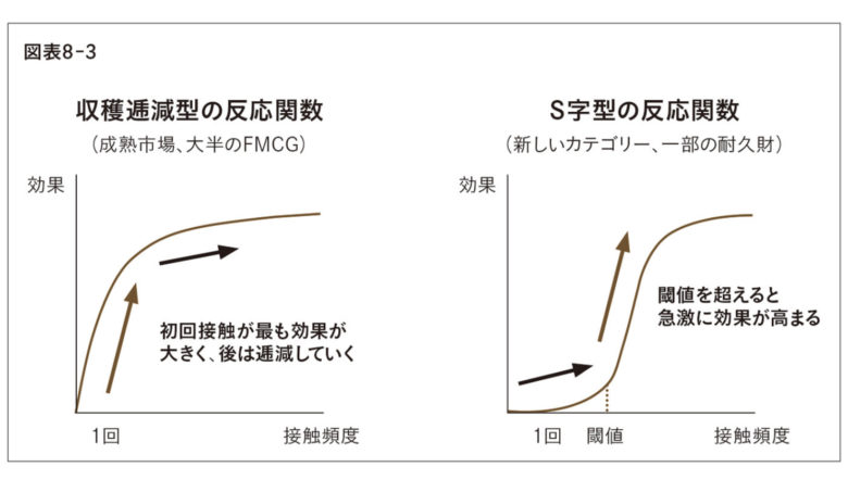 - 成熟市場における購入間隔の短いカテゴリー(消費財など)では、収穫逓減型(1回目が最も効果的で、2回目以降が減少)の反応関数になりやすい。よって同じ人に2回3回と重複接触させるより、最初の1回をあてる人数を増やしたほうが良い