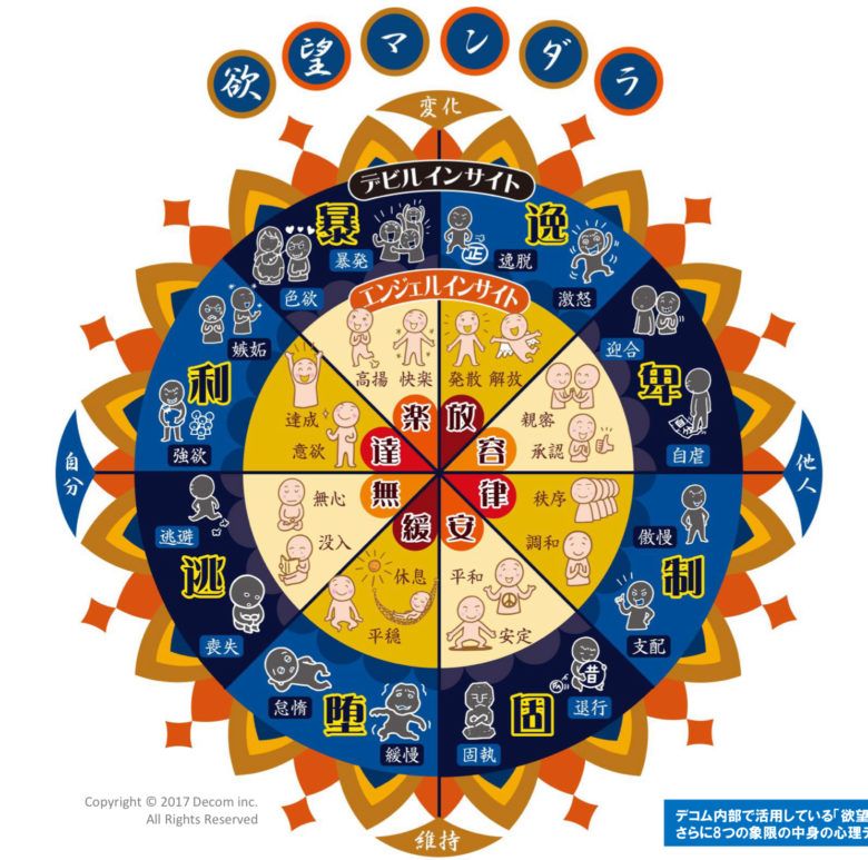 これは人間の本能的な欲求が8方向あり、それぞれエンジェルとデビルの側面が存在することを示しています。例えば「律」の欲求では、相互理解の上で成り立つ「調和」を求める一方で、暴力的な「支配」の欲求が存在します。(性善と性悪の両方存在)