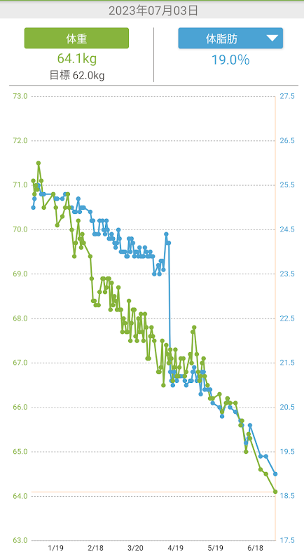 7/3:64.1キロ(体脂肪率 19.0%) 対1/6 △7.1キロ(体脂肪率 △6.2%)