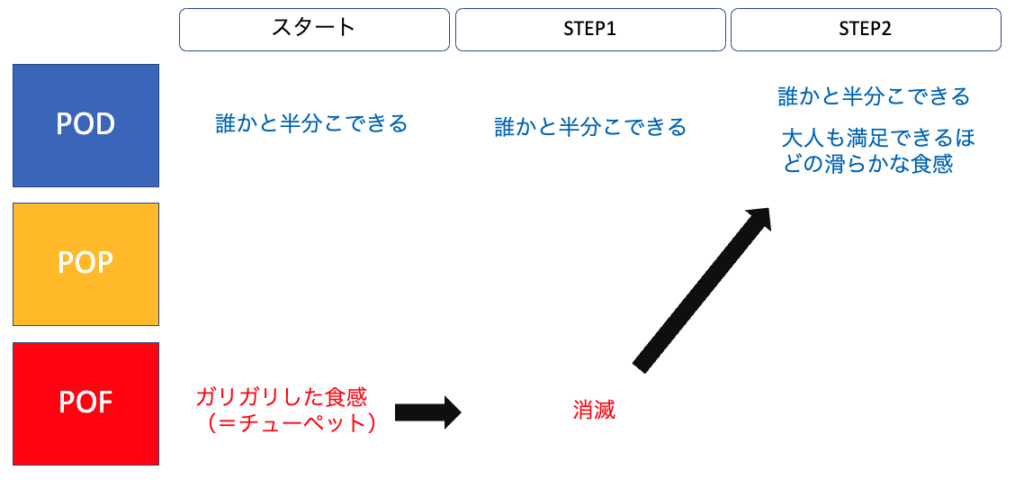 これによってPOFを消滅させ、最後は食感イメージをPODにまで昇華させた結果、なんと2ケタ成長を達成したそうです。