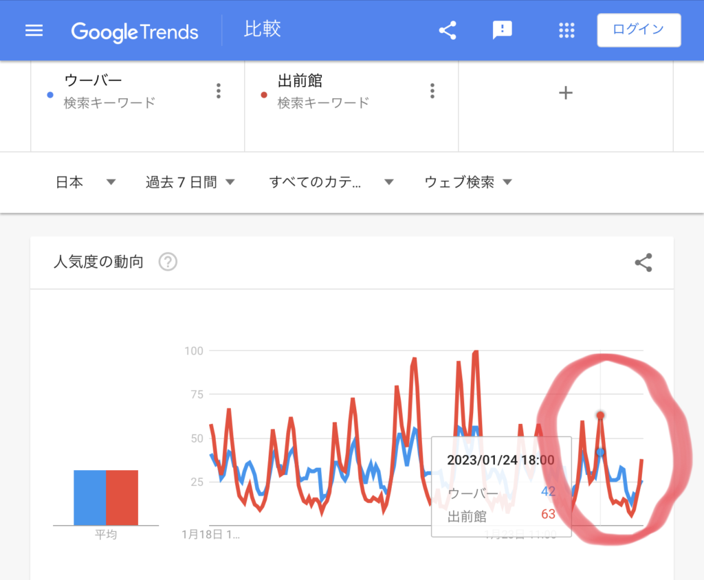 Aの人たちは、本来外に出て済ます予定だった用事を、他人に頼もうとする(お金で解決)と予想されます。ではウーバーや出前館のGoogle検索数(売上と相関ありそう)は増えているのでしょうか?