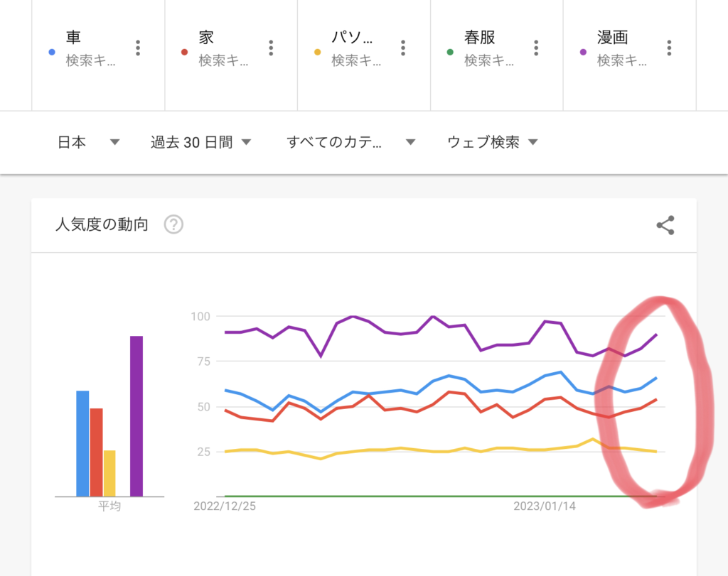 ↑直近30日間で、「車(青)」「家(赤)」「パソコン(黄)」「春服(緑)」「漫画(紫)」を検索しました。どれも増えていないですね。※車と家が上がっているのは、雪がらみの検索で、購買とは違う内容ばかりでした。