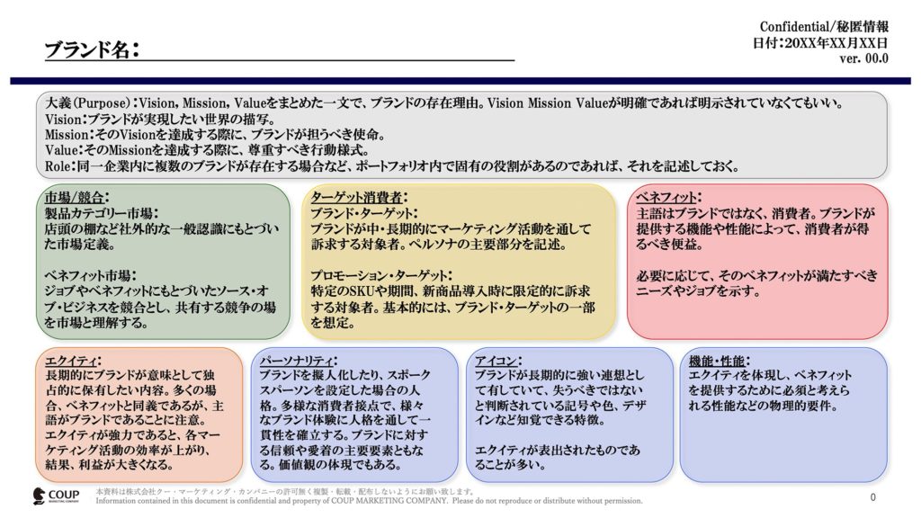 どういうブランドとして生活者に記憶・想起されたいかを、一枚にまとめておくと便利です。施策の一貫性を担保したり、社内外メンバーとの共有や引き継ぎにも有効です。