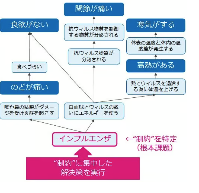 • 未来問題構造ツリー:雲(対立解消図)を使って見つけた問題解決策を実行したらどうなるかを検証するための手法。根本的な問題が解決した状態で現状問題構造ツリーがどう変化するのかを示し、新たな問題(ネガティブ・ブランチ)が発生していないかどうかなどを検証する。