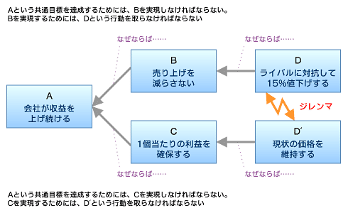 • クラウド(雲):問題の根本的な原因となっている矛盾や対立(コンフリクト)を解消するための手法で「対立解消図」とも呼ばれる。現状問題構造ツリーで根本的な問題を見つけ出した後、この雲を使ってどう解消したらいいのか「何に変えればよいのか」を考える。
